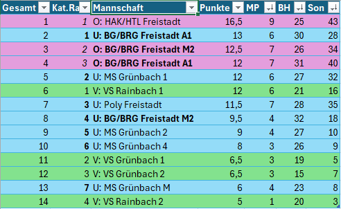 Gleich drei der vier bestplatzierten Teams kamen aus dem BG/BRG Freistadt. Besonders erfreulich waren die starken Leistungen der Mädchenmannschaften: Sowohl die Unterstufen- als auch die Oberstufen-Mädchen sicherten sich jeweils den Pokal als beste Mädchenmannschaft ihrer Kategorie. Die jüngere Mädchenmannschaft erreichte insgesamt den 8. Platz von 14 Teams und den 4. Platz in der Unterstufe, ein beachtliches Ergebnis.
