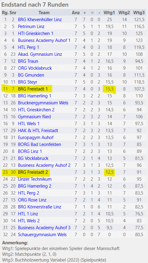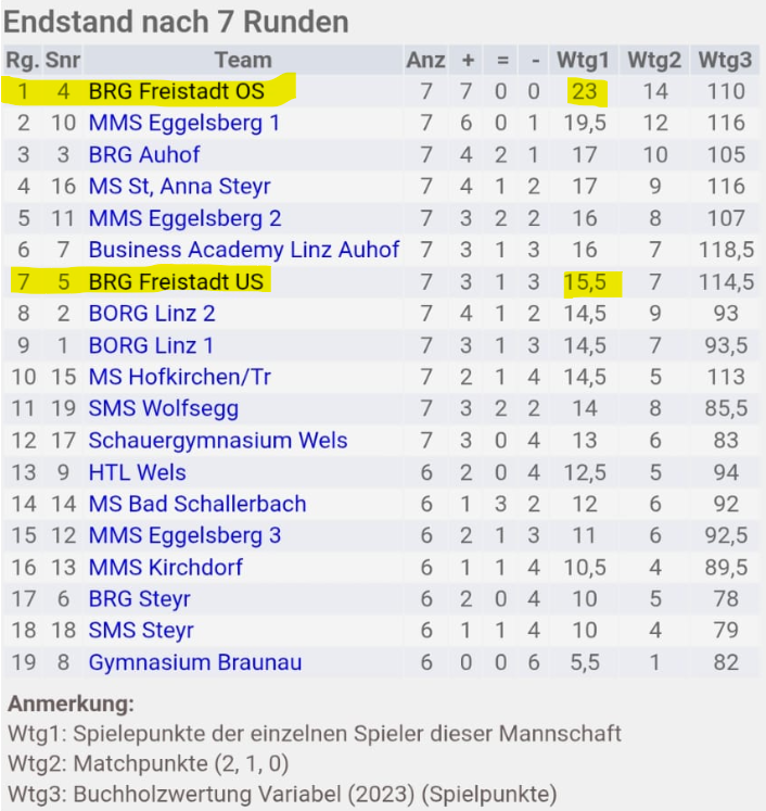 Die Oberstufen-Knaben zeigten mit den Plätzen 11 und 23 von insgesamt 32 Mannschaften eine beeindruckende Leistung, zumal gleich drei der stärkeren Spieler/innen aufgrund der zeitgleichen Sprachreise nicht teilnehmen konnten. Auch ihnen gratulieren wir herzlich für die tolle Performance!