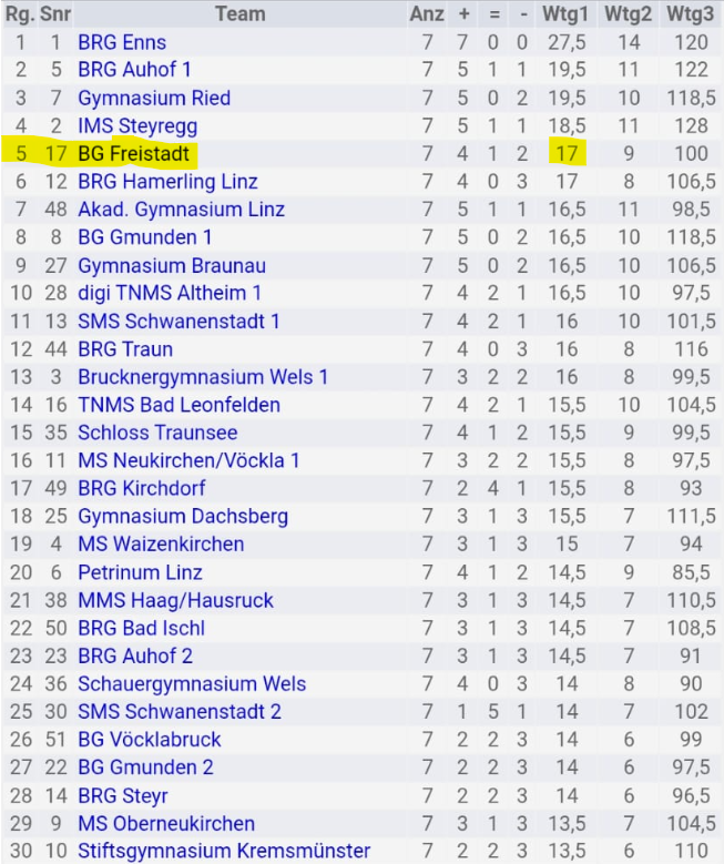 Aus Sicht des BG/BRG Freistadt verliefen die Bewerbe sehr erfolgreich: Die Oberstufen-Mannschaft der Mädchen gewann den Mädchenbewerb außer Konkurrenz. Bedauerlicherweise gibt es offiziell keine Oberstufen-Mädchen-Wertung. Die Unterstufen-Mädchen holten den hervorragenden 5. Platz in der Kategorie Unterstufe. Herzliche Gratulation dazu!